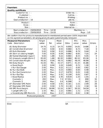 我們的安瓶機(jī)還備有在線攝像的尺寸和外觀檢測系統(tǒng),可同時(shí)檢測到安瓶的所有缺陷,對安瓶百分百檢測,通過檢測的安瓶保證百分之百是合格的,該生產(chǎn)線還裝有生產(chǎn)信息的記錄系統(tǒng),自動生成產(chǎn)品的檢驗(yàn)報(bào)告