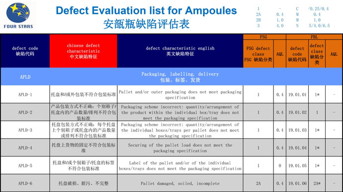我們對安瓿的缺陷制定了缺陷評估表,對95項(xiàng)缺陷進(jìn)行質(zhì)量控制,涵蓋了全部的缺陷項(xiàng)目,能使您對我們的產(chǎn)品質(zhì)量完全放心。