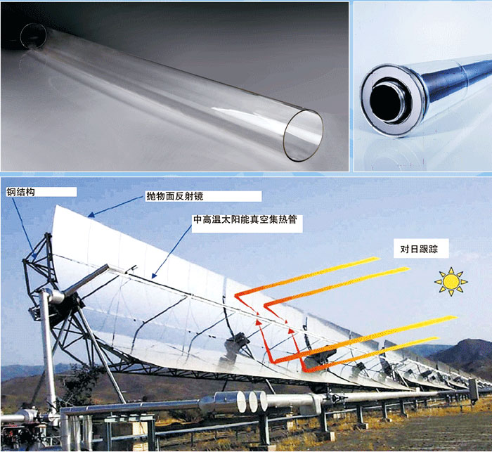 槽式太陽能熱發電系統的核心部分就是聚光集熱系統,而聚光集熱系統的核心部件就是中高溫太陽能真空集熱管。