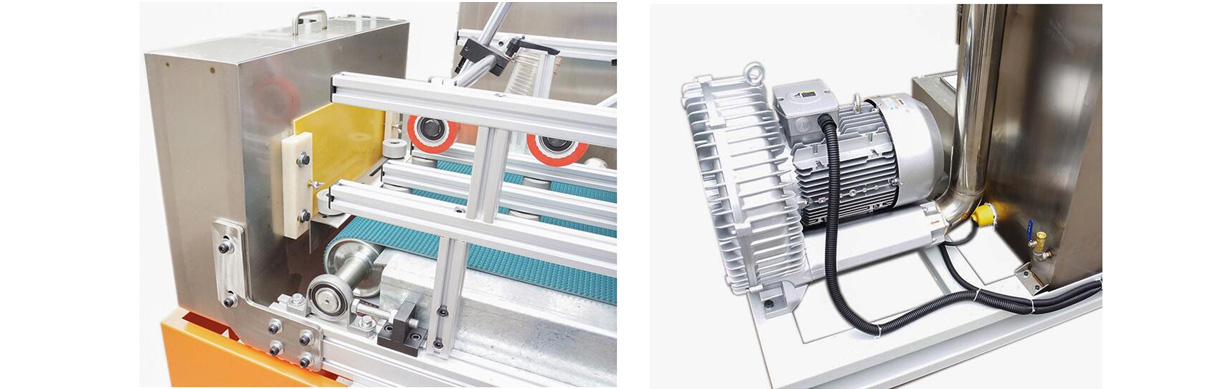 Independent pressure wheel and feed baffle system can ensure the smooth transmission of work (also optional pneumatic pressure).
